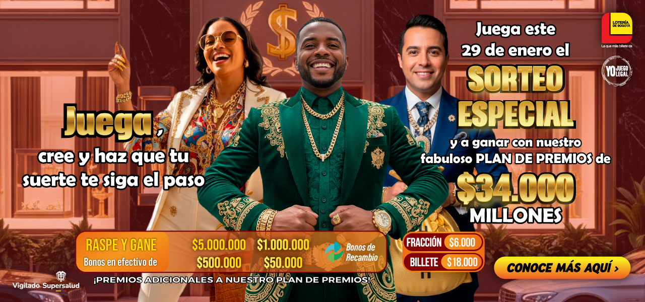 Con el sorteo especial de fin de mes de tu Lotería de Bogotá, nuestros jugadores podrán dejar que sus preocupaciones descansen en paz y convertirsen en millonarios de por vida. Jugando este 26 de octubre de 2023 podrás participar por los $12.000 millones del premio mayor, 49 premios secos, el lanzamiento adicional de un carro híbrido Mazda CX-30, bonos en efectivo y bonos de recambio que trae el Raspa y Gana Físico.